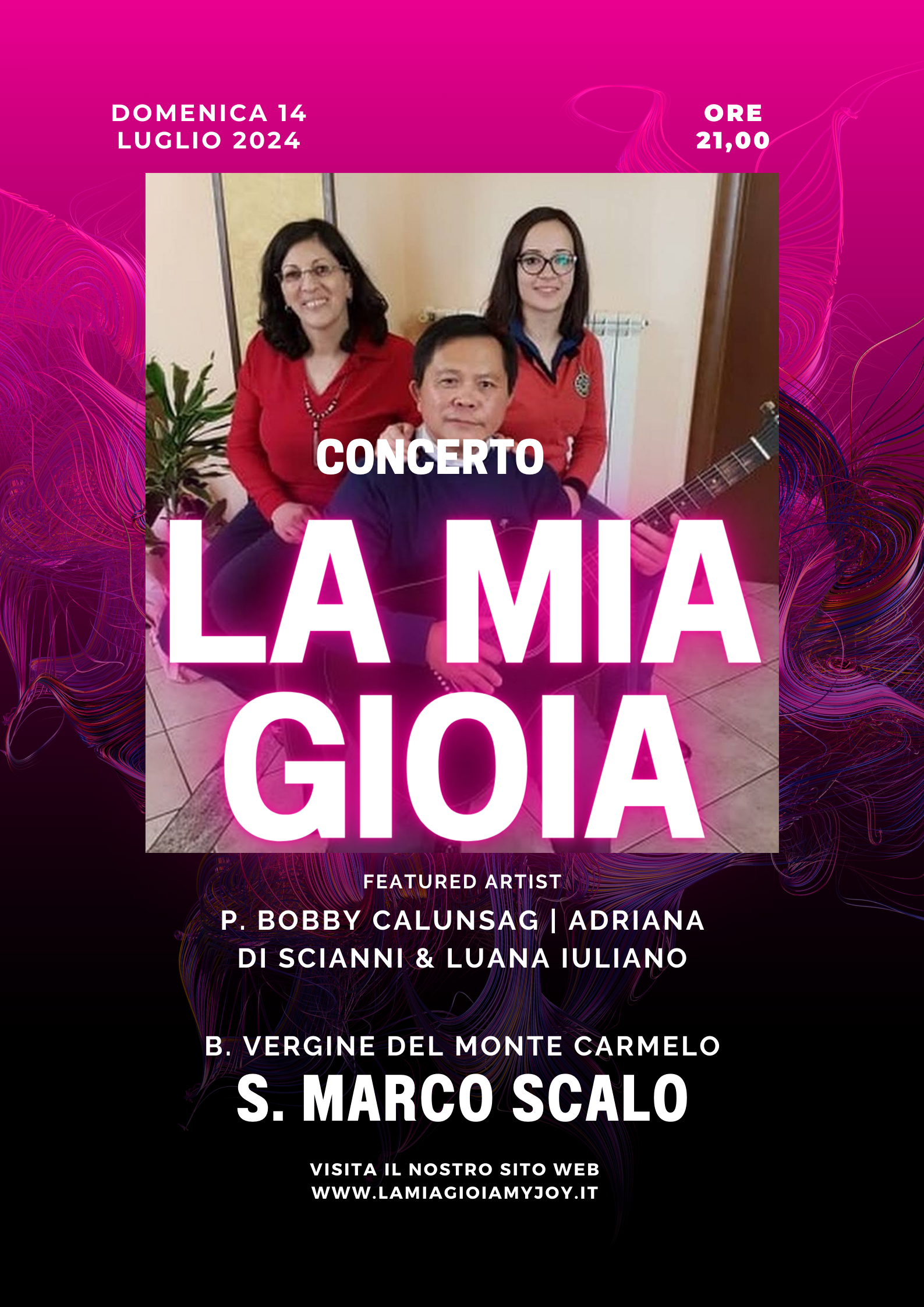 Caro il nostro Padre Bobby e gruppo, io sono commossa solo a pensare tutto quello che ci regalate ogni volta che venite a fare concerto di preghiera, penso a come mi sento felice, a come riesco ad essere serena, carica di una gioia interiore molto salutare. Mi sento guarita, mi sento volare, tornate presto.